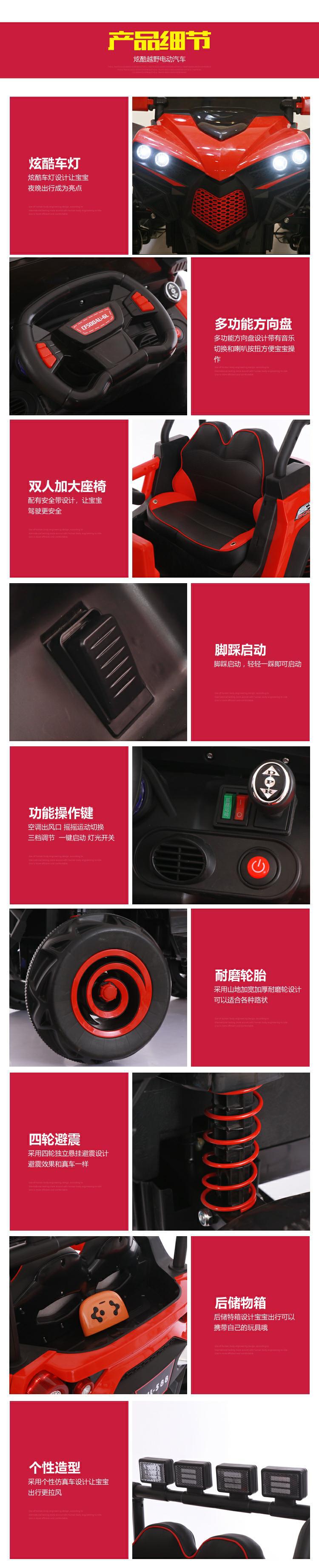 MOTO: QUATTRO 550 MOTO!!! Massive 4 WHEEL dirve !!! SUSPENSION SHOCK ABSORBER!!! Double open door Battery level display Led big light 2.4g one to one remove control Music and story function Usb and sd card function Swag function Handy handle for moving Unbelievable Air Condition!!! Extra big seat for two!!! Car size:135x95x90mm