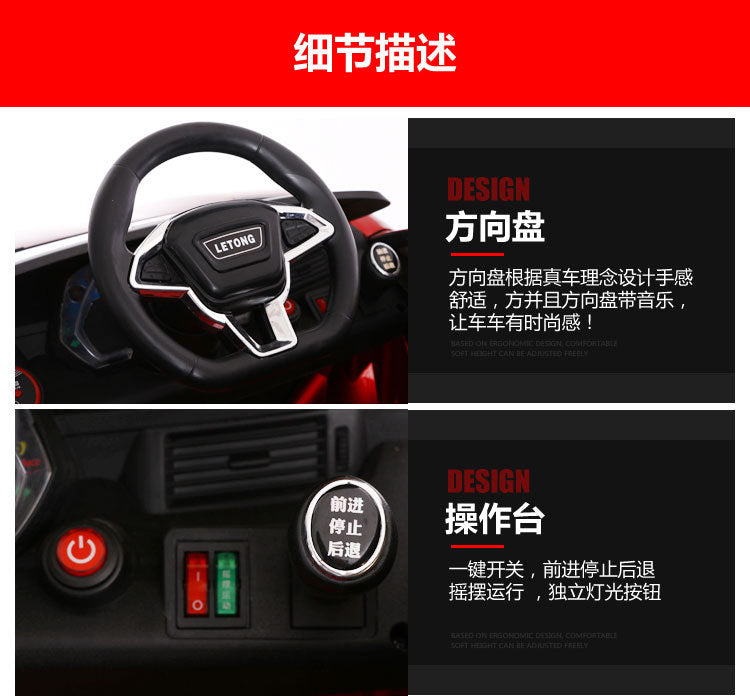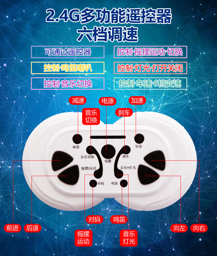 Battery level display Led big light 2.4g one to one remove control Music and story function Usb and sd card function Swag function Handy handle for moving Both side open door Bluetooth music speak!! R/C- REMOTE CONTROL